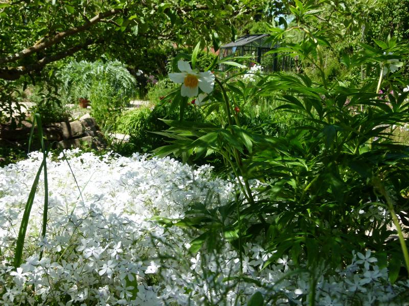 Paeonia emodii, vermutl. "Late Windflower" über dem Phlox divaricata.