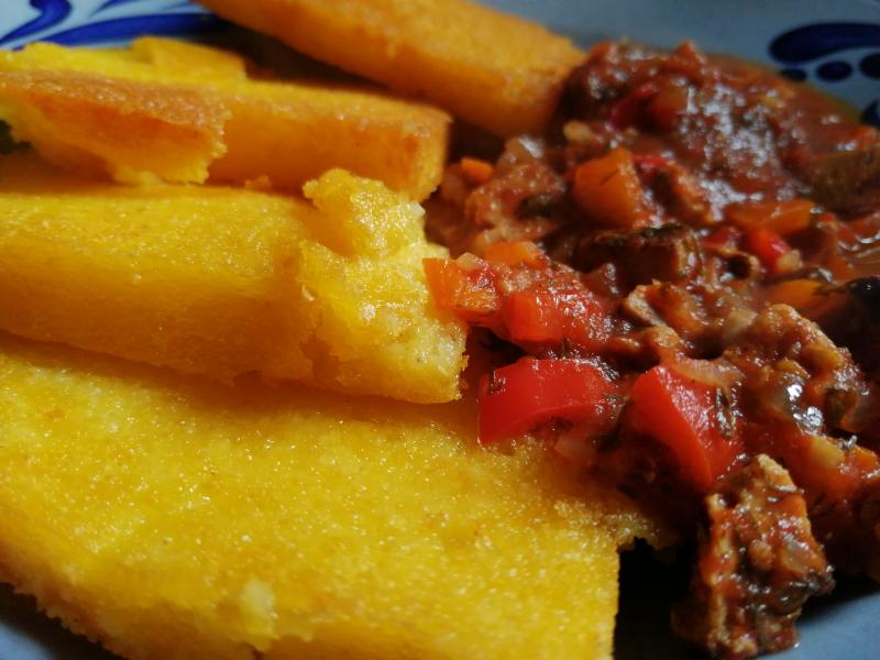 Gebackene Polenta mit Soße aus den letzten Gartentomaten und Gartenchili.