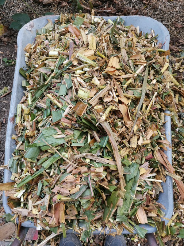 Die Pflanzen sind bereits gehäckselt. Geht nicht so toll wenn das Laub noch `frisch´ ist. Nun ja, waren nur 9 Schubkarren. Im Bild sind 5 die den Boden verbessern und CO2 speichern.