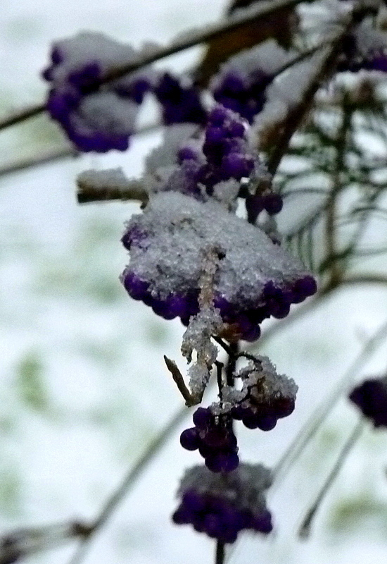 eben war alles weggetaut, jetzt hat der Liebesperlenstrauch schon wieder Mützchen