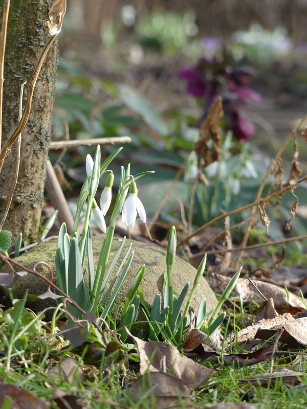 Geht man etwas weiter nach links, kann man ganz hinunter in den Garten schauen. Am "Waldrand" leuchten die Schneeglöckchen in mittlerweile überraschend großer Zahl, nur die Elfenkrokusse dürfen sich gerne noch etwas besser vermehren. Wenn ich morgens aus dem Schlafzimmerfenster schaue, leuchtet es schon aus der Ferne. :)