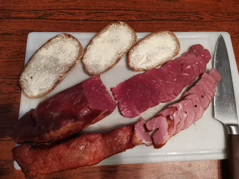 Gestern gabs Selbstgeräuchertes vom Wochenende. War Versuch Nummer 2. Heißräuchern mit Kaltrauch. War gut.