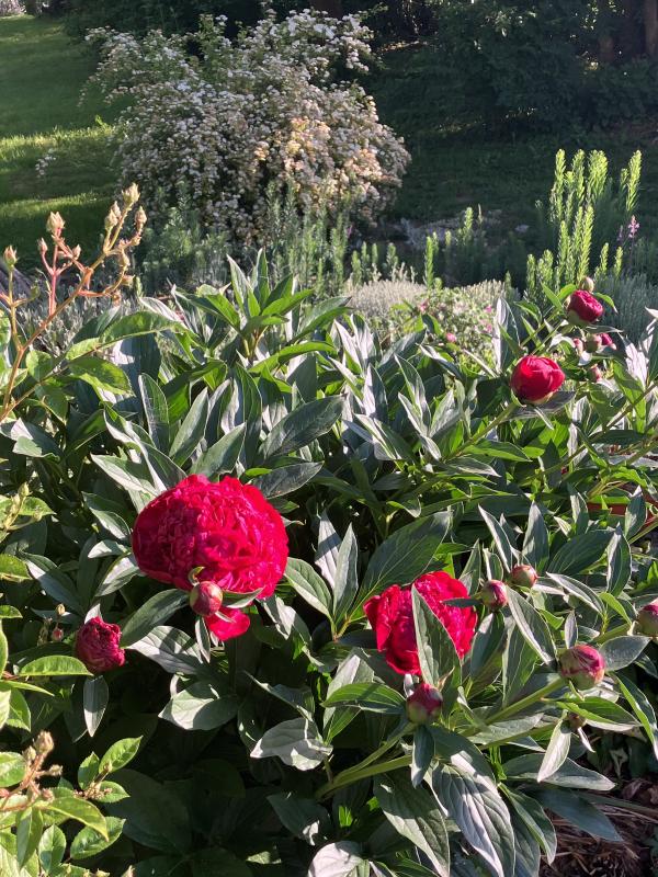 Die Staudenpfingstrosen kommen. Und im Hintergrund Linaria purpurea wie Raketen, zu viele..(Dabei bin ich doch dort mit harter Jäthand durch im Herbst? Tja…;))