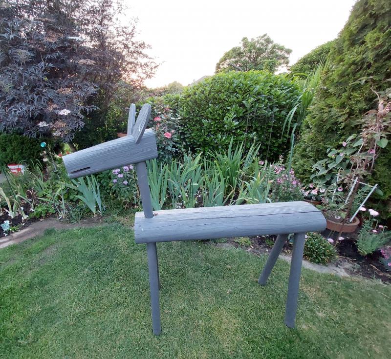 Die Irisse sind verblüht, dann kann das Rückenpferd wieder vor dem Irisbeet stehen.