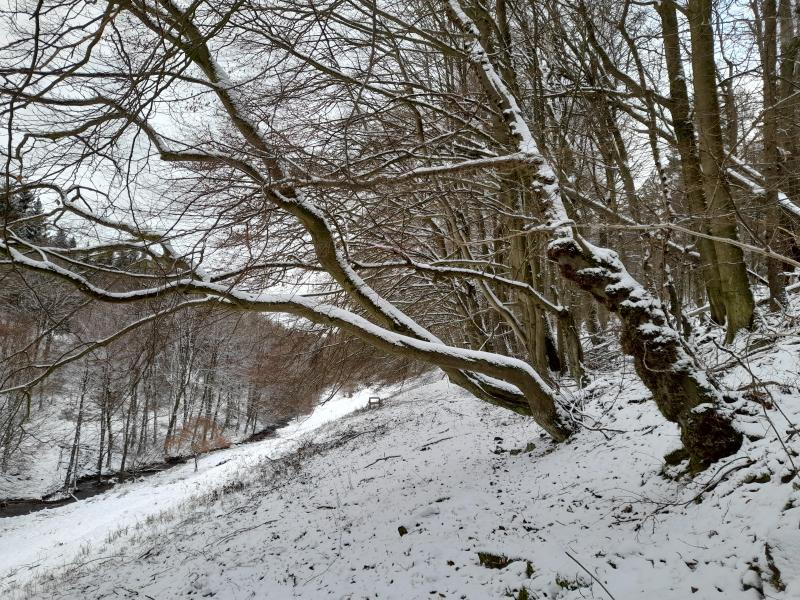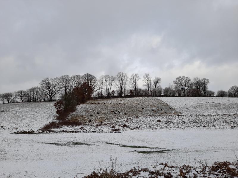 Es kommen gleich die Bilder der großen Herde. Winterwounderland. Und ja. Morgen kann viel Schnee kommen. Man sieht aber wohl das Mikroklima dieser Fläche. Während die Skudden tief im Schnee stecken, haben die hier sogar noch Zugang zum Futter.