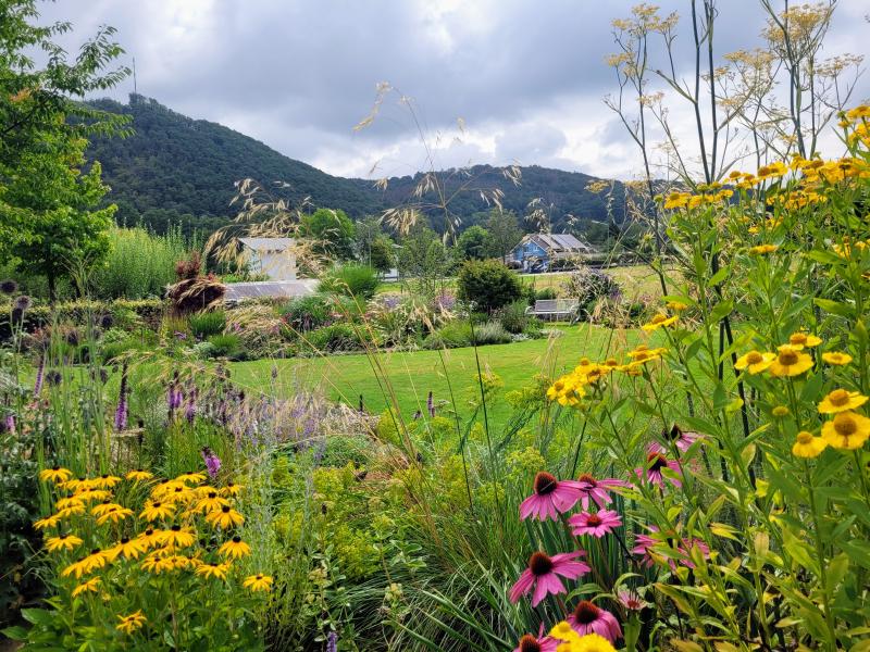 Rudbeckia ganz links und das selten zur Blüte kommende Eulalia-Gras, Rosen sind auch da