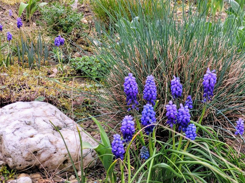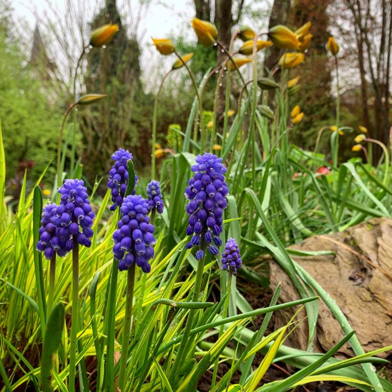 Und mitten in der Hakonechloa blüht nun (ganz banal ;)) Muscari, während sich die dahinter stehende Tulipa sylvestris im Dauerregen schwertut.