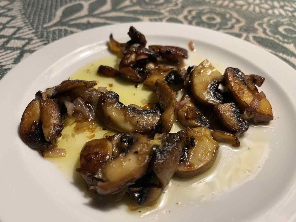 Spitzkohl mit Meersalzbutter und etwas Sojasoße gebraten sowie Champignons mit Schalotten gebraten und mit weißem Balsamico abgelöscht zum Chardonnay 2019 "Le Chantenelle"