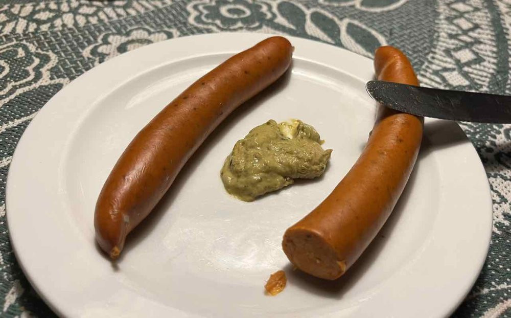 Debreziner gesotten mit Basilikumsenf und Kartoffelpüree mit Lauchzwiebeln zum Schweinsbräu Dunkel aus Hermannsdorf
