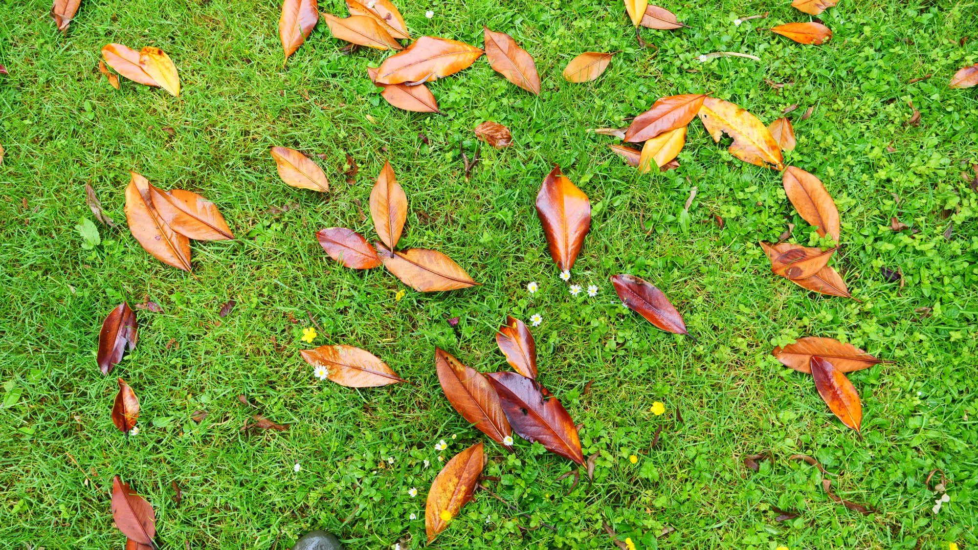 Dieses Jahr 'mausert ' sich unsere Magnolia grandiflora mal wieder. Das Beet und der Rasen darunter sind von den fast holzigen, trockenen Blättern bedeckt. ( Der Rasen wurde bereits mehrfach abgeharkt)