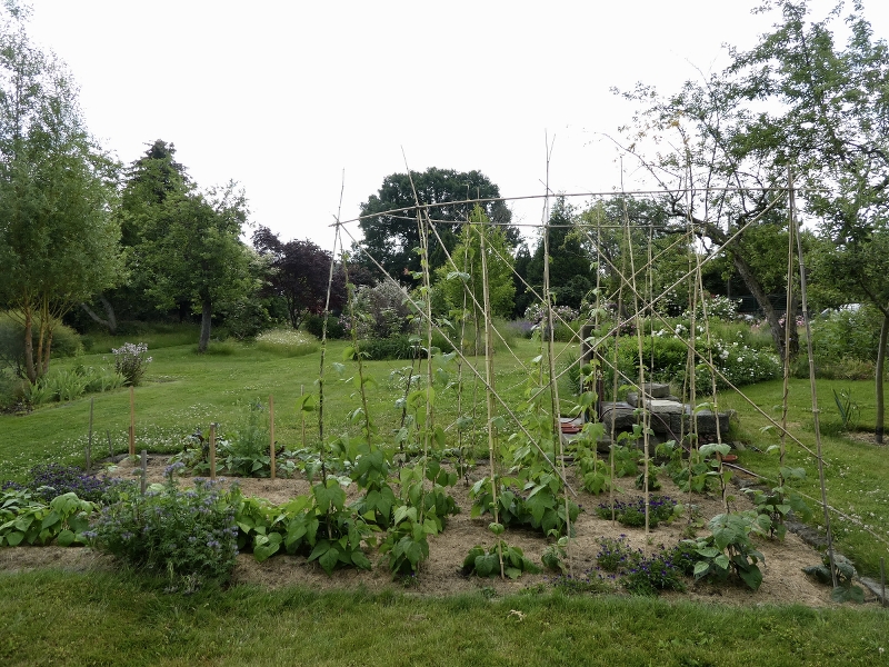 Die Stangenbohnen sind oben angekommen, die Buschbohnen sind ähnlich wie der Sellerie immer wieder von Vögeln abgerupft oder gleich ganz rausgerissen worden. Die Überlebenden der ersten Aussaat beginnen zu blühen, die dritte Saat keimt gerade ...