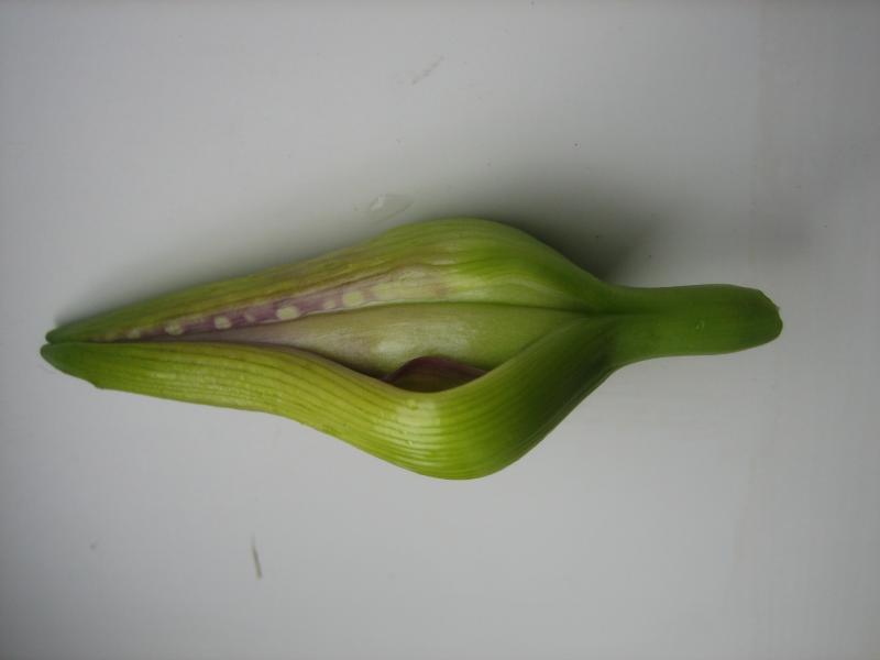 und noch eine befallene Knospe.Die Knospen sind immer gegenüber den anderen Knospen derselben Pflanze deformiert, aufgebläht, häufig zu sehen auch an bläschenhaft gewellten Rändern der Knospenblätter.