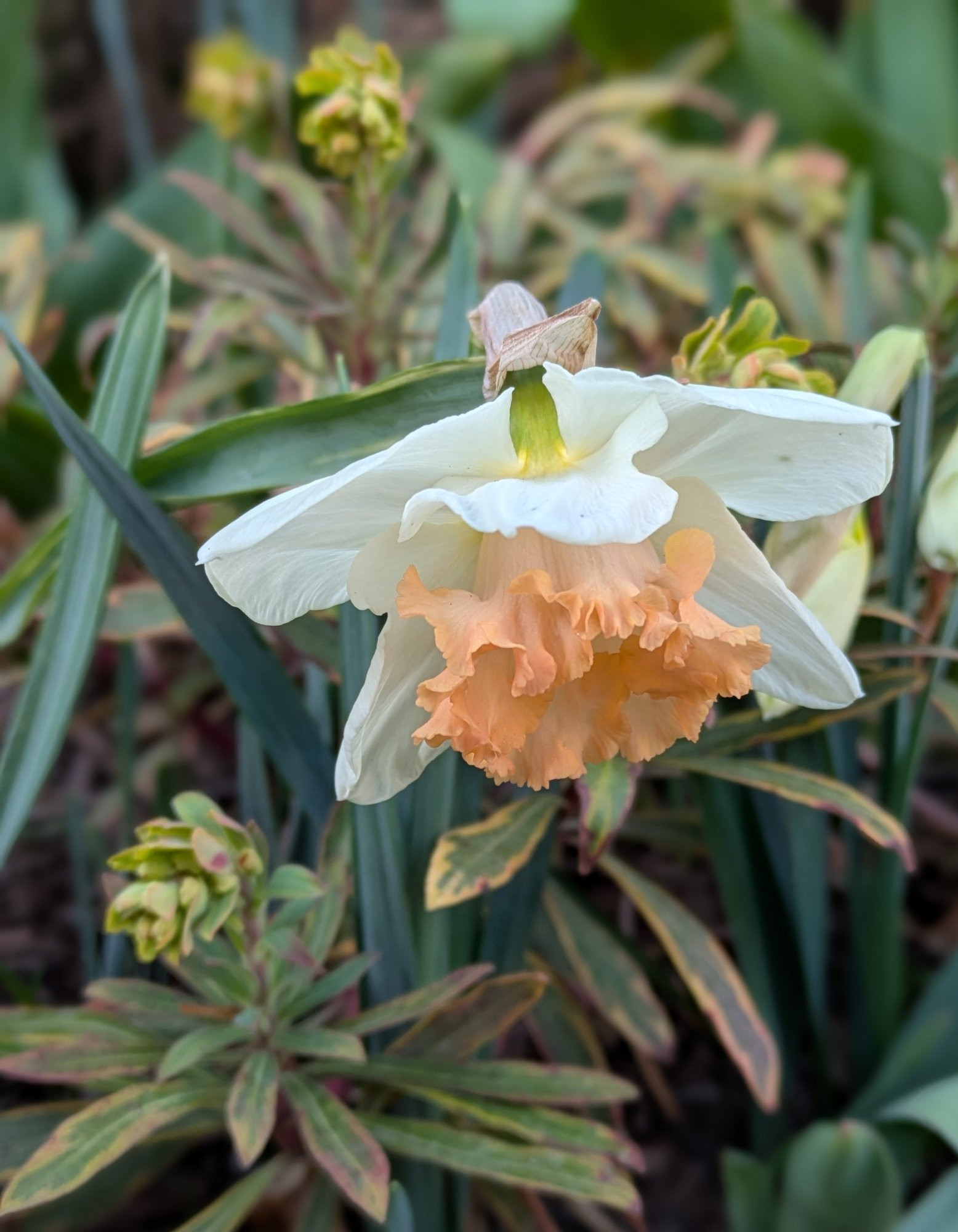 Meine Lieblingsnarzisse mit aprikotfarbenen Trompeten: Rosy trumpet. Ich liebe die Ton-in-Ton-Kombination mit der frühen Tulpe praestans Shogun. Leider sind beide hier nicht besonders ausdauernd. Weil ich sie so mag, pflanze ich regelmäßig nach.