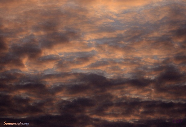 will auch mal versuchen, ein Wolkenbild einzustellen.Leider war heute der Sonnenuntergang nicht annähernd so schön, wie gestern - da hatte ich aber keine Kamera mit.Deshalb nun eins von heute früh - vielleicht finde ich ja Gefallen an der Wolkenfotografiererei.