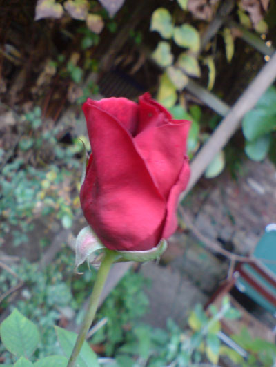 Auf etwa 10 cm Höhe blüht Scarman's Velvet China. Die Triebe sind noch zu dünn, um die Blüten zu stützen. Da ich mich an der Stelle nirgendwo auf den Boden legen kann, von oben fotografiert