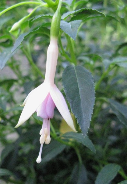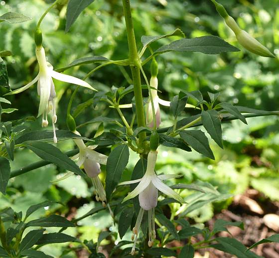 Dann werfe ich zu Vergleichszwecken mal ein vorjähriges Foto meiner F. magellanica 'Alba' ein. Bei der erscheint das Rosa nur gaaanz zart.