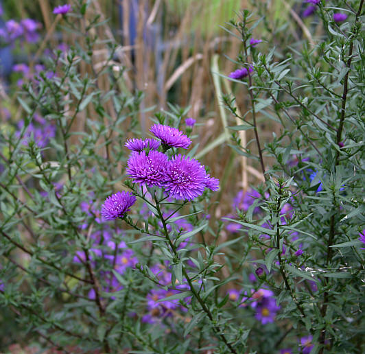Neben vielen tollen Astern fiel mir eine besonders auf: 'Vasterival'. Woher sie stammt, entzieht sich meiner Kenntnis. Die Einzelblüten sind auf den ersten Blick fad und eher langweilig. Aber das ganze Erscheinungsbild lässt sie auf Anhieb auf die fordersten Ränge springen. Man kann sie als gesund, locker, standfest, imposant, grazil, kontrastreicher, dunkler Stängel, rosalila Blütchen. Wunderschön in Sträußen!Eine weitere reich- und langblühende Neuheit ist 'Treffpunkt'. Sie entstand bei Ruth Treff in Darmstadt, eine Hybride zwischen einer unbekannten, blauen A.nb und Aster cordifolius 'Blue Heaven. Das dunkle Tintenblau baut sich an halbhohen Blütenkuppeln auf. Die Blütezeit beginnt schon im August und endet im Oktober.'Ochtendgloren', auch unter 'Pink Star' geführt, ist eine Sorte von Piet Oudolf, die sehr gesund ist und sich nicht nur als Beiwerk eignet, sondern in Kombi mit dunkelblauen Astern auffällt. Pflanzt einmal Aster n.b. 'Sailor Boy' neben 'Ochtendgloren'!Bei meinem abendlichen Rundgang durch unsere Schauanlagen fiel mir auch 'Picasso' auf, eine Sorte aus der Aster dumosus-Gruppe. Sie blüht so reich und verschwenderisch in einem angenehmen Rotton. Es gäbe noch viel von den Astern zu berichten. Fernwirkung hat auch 'Poollicht' mit ihrer fahlen Blütenfarbe.Was mir jedenfalls auffällt, ist die bekannte Tatsache, dass die Sortimente immer ärmer werden. Dabei sind Astern unverzichtbar und durchaus nicht Schnee von gestern, wenn man Schwung ins Sortiment bringt! Und den Kunden klar macht, dass die "inneren Werte" zählen und nicht das aufgemotzte Äußere, chemisch gestauchte. Aber wie war doch noch mal die Geschichte von Don Quichote?