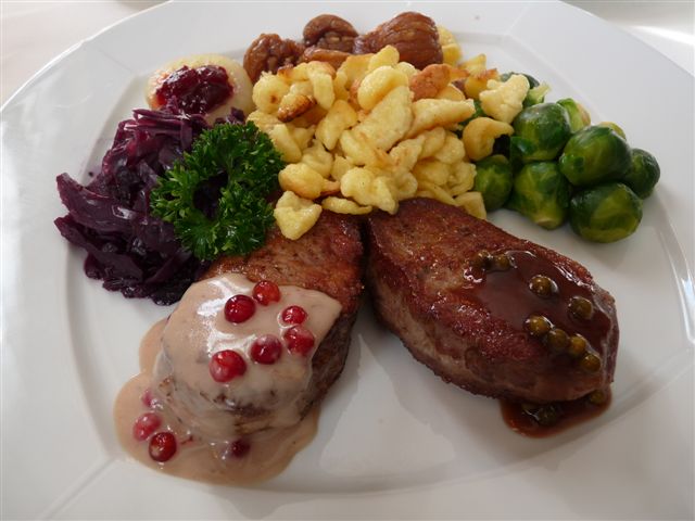 danach Wildschwein-Steak mit Knöpfli, Rotkraut, Rosenkohl und Kastanien