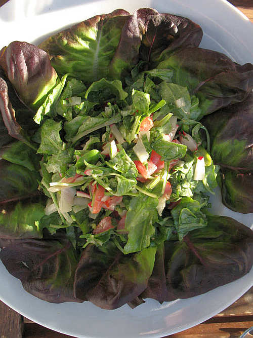 Es gab Ziegenfrischkäse mit Tomaten auf Salat aus dem Garten. Blüten: Rotklee und Bärlauch