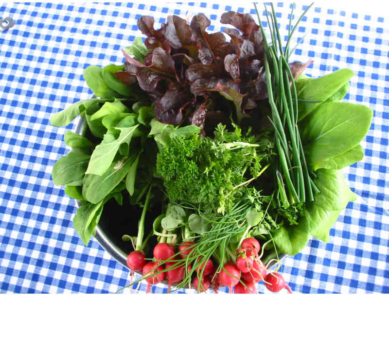 gegrillter salatBereits gestern zum grillen geerntet und verspeist:gelber Pflücksalat, brauner Kopfsalat, Radieschen, Kresse, Ruccola, Schnittlauch