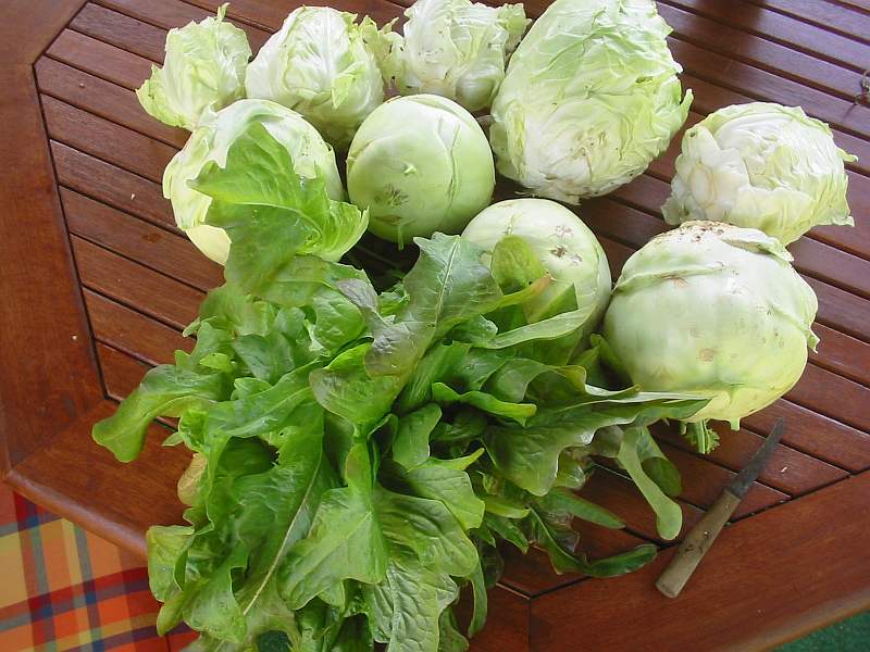 Auch "Verschenksalate",Den wie immer zu spät geernteten Spitzkohl (bzw. das, was die Schnecken und eer Gammel übriggelassen haben), Bis auf drei mickerige die letzten ersten Kohlrabis und Salat für uns selber. Zuckerschoten gestern und Johannisbeerten und die von den Vögeln übriggelassenen drei von fünf ersten Kirschen eines neuen Bäumchens.