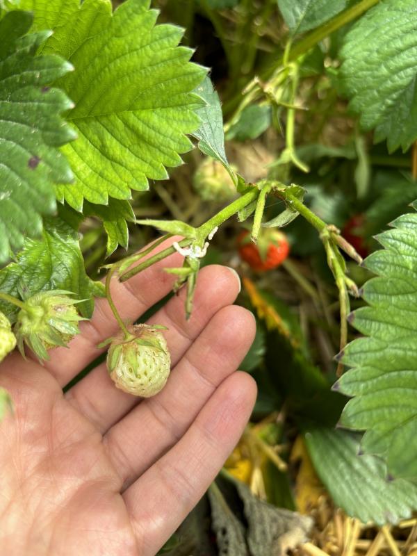 Hier bei einer unbekannten Sorte, wohl ein Senga Sengana Abkömmling, der hier irgendwann einmal selbst aufgetaucht ist und dann sehr starker Befall bei Daroyal.