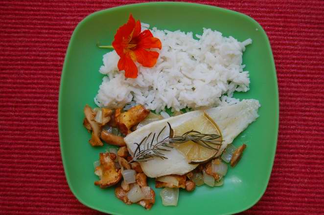 Heute gab es Schollenfilet aus dem Ofen, dazu Basmatireis und Pfifferlinge mit Zwiebel.
