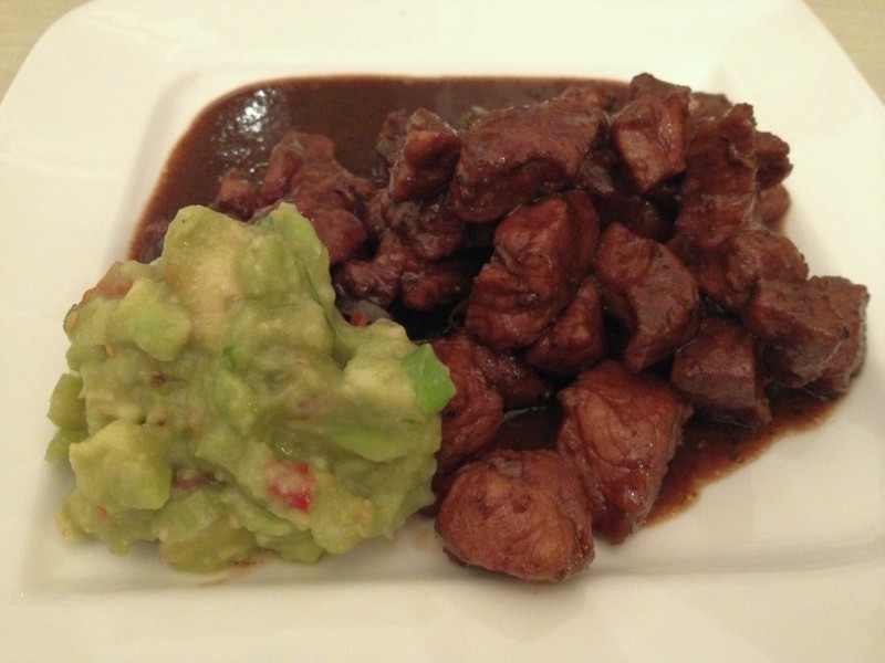 es gab geschmortes asia-crossover-schweinefleisch (mariniert mit zitronensaft, heller sojasauce, öl, grüner pfefferschote, wirklich unmengen frisch gemahlenem schwarzem pfeffer, meersalz und mirin/koch-sake) und guacamole.