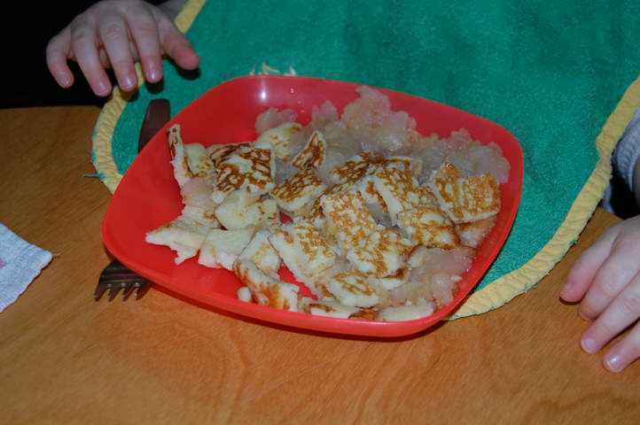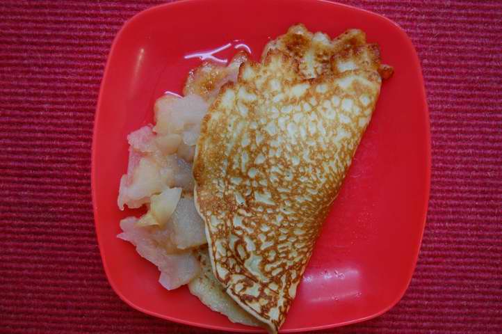 ;DHeute gab es Eierkuchen (das sind in dieser Gegend die flachen pfannengebackenen Dinger, die hauptsächlich aus Buttermilch, Mehl und Ei bestehen ;) ) mit leicht gesüßtem Apfelkompott aus Riesenboiken (richtig geschrieben?) :D .
