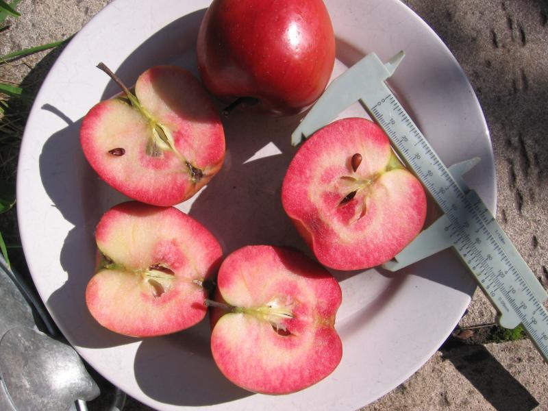 Nochmal zu Redlove Kohlhaas (siehe Bild unten): Für mich allenfalls ein "halber Redlove" - so hell ist das Fruchtfleisch, eigentlich nur eine rosa Schicht unter der Schale, bevor darunter das weiße Herzfleisch beginnt. Geschmack ist etwas unterschiedlich von den übrigen Redloves. Da ist zwar auch das "Beerenartige" noch spürbar, aber darunter ein anderes, neueres Aroma, das ich von den übrigen Redloves nicht kenne, fast so etwas wie "Braeburn mit Redlove-Einschlag", nur dass es wohl doch etws anderes als Braeburn ist, was hier durchschlägt. Ein richtiger Apfelkenner würde wohl wissen, welche Elternsorte sich hier geschmacklich zu erkennen gibt.