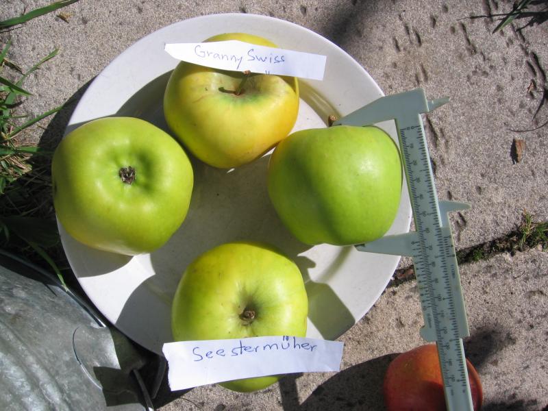 Für mich angenehmer, frisch-säuerlicher und interessanter finde ich die Aromen des Seestermühers. Dazu kommt, dass der Seestermüher, zumindest in seinen Abveredlungen auf M26, MM111 und Bittenfelder Sämling ohne chemische Behandlung frei von Marssonina und anderen Blattkrankheiten geblieben ist. Zum Granny Swiss kann ich hierzu nicht mehr sagen, als dass er mit einer Behandlung im Mai recht gut dasteht - ohne zu wissen, ob die unbedingt notwendig gewesen wäre. Mein "Originalbaum" Seestermüher auf M9 muss leider wegen Krebsbefalls an der Veredelungsstelle, vermutlich eine Schluderei der Baumschule Schw.......er aus Schleswig-Holstein mit Duaxo behandelt werden.