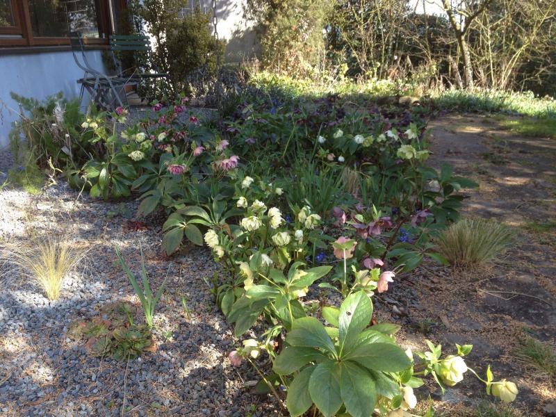Bei den Helleboren ist mittlerweile ziemlicher Zuwachs. Ich hatte ursprünglich eine schieferfarbene und noch ein paar von Frau Schmiemann und eine weiße gefüllte von Ashwood.Die haben sich schön verkreuzt.