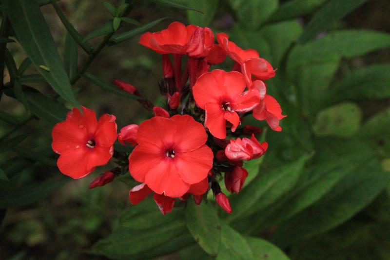 Zum Teil stehen rote Phloxe zusammen, eben vor grünem Hintergrund, zum Teil orange zusammen um einen gelblaubigen Strauch herum.Zwischen die roten passen sehr gut Persicaria, die mit ihren verschiedenen Rottönen die Phloxfarben aufnehmen können. Oder Geranium phaeum Samobor z. B., mit seinen unterschiedlichen Sämlingen. Hakonechloa macra 'Nicolas' geht gut. Eine Clematis viticella 'Rubra' und ein rotlaubiger Strauch stehen außerdem zwischen den roten Phloxen. Und in den letzten beiden Jahren habe ich einige Chrysanthemen gepflanzt, die aber überwiegend nach den Phloxen blühen. Mit mehr Platz könnte man ausprobieren, welche mit Phlox blühen, viele Sorten passen farblich sehr gut zu roten und orangen Phloxen.