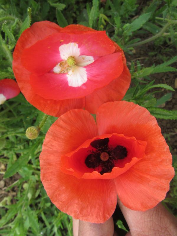 so, jetzt. Mich wunderte bei meinen Exemplaren die kräftig reinrote Farbe und der schwarze Basalfleck. Papaver rhoeas, Klatsch-Mohn. Mohnblumen auf Feldern kannte ich anders irgendwie. Jetzt ist klar, der auf Feldern heißt Papaver dubium, Gewöhnlicher Saat-Mohn. Welcher nun die Erde von Verdun ein Jahr nach dem Krieg rot färbte? Keine Ahnung.