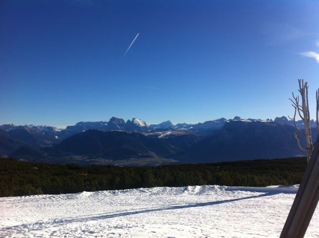 Das Bild zeigt den Blick auf die Seiser Alm, kein Schnee. Der Schnee im Vordergrund ist nur Staffage, sprich Kunstschnee.