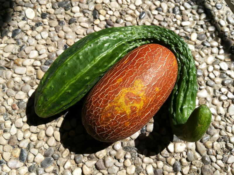 Melone Ginger's Pride (auf dem Teller), Melone Ineya (rechts) und zwei Gurken (bin mir gerade nicht ganz sicher welche Sorte, das Muster gehört jedenfalls so).
