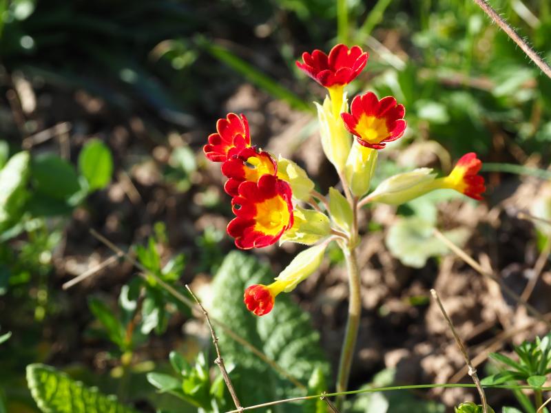 Im Wiesengarten habe ich noch die drei Primula veris fo. rubrifolia fotografiert. Ständig hatte mich Axel ermahnt, dass das nicht Primula elatior seien, und mich endlich in Bewegung versetzt die Dinger aus dem Schatten ans Licht zu zerren.