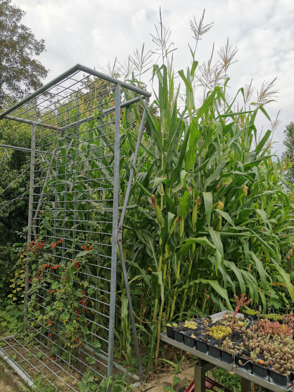 Aktuell sind wir Ende Blüte, die Pflanzen im Garten stehen 3,73m hoch. Kolbenansatz auf 1,6m, das ist üble Statik. Vor ein paar Tagen zog ein Gewitter (45mm) durch, die Stützwurzeln sind noch nicht komplett ausgeprägt, wie gesagt, Ende Blüte. Ist nochmal gutgegangen. Nichts umgekippt. Ab nächster Woche sollten sie stabiler stehen. Wasser ist bis zur Ernte im Herbst genügend da.