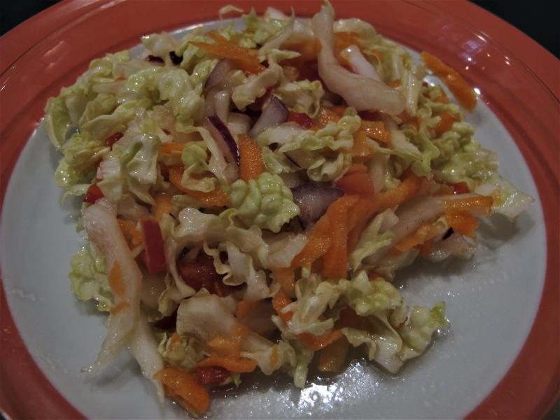 chinakohl, paprika, rote zwiebel, karotte, marinade aus apfelessig, honig, s & p, spritzer tabasco, neutrales öl.