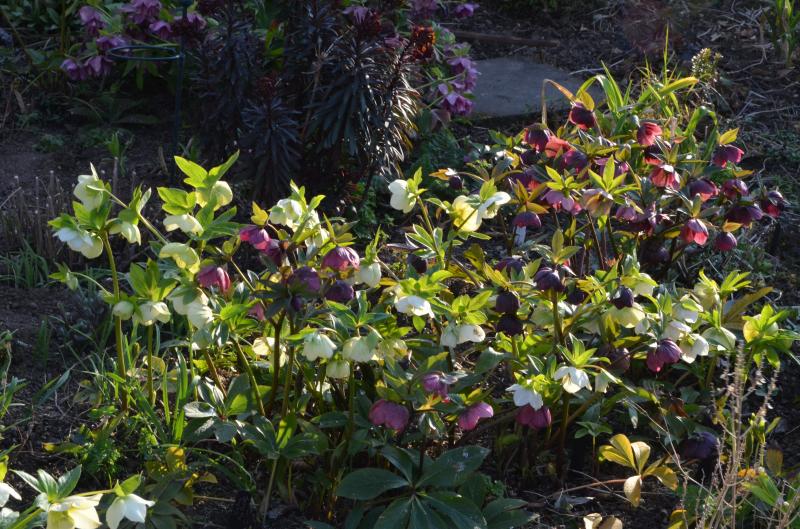 Die Sonne bringt die dunklen Helleboren wunderbar zum Glühen