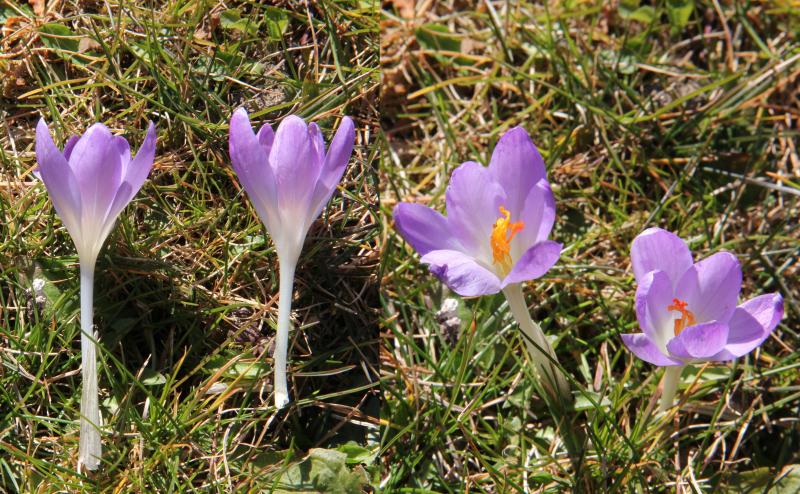 Hier, die hintere Gruppe, einer der Sämlinge, die vielfach im Rasen unter den Elfen auftauchen, etwas später als diese blühen und wenig früher als die ebenfalls in der Nähe wachsenden, hierher versamten C. vernus.