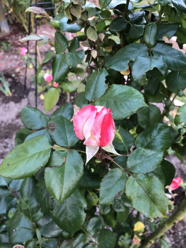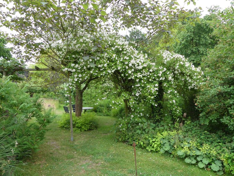 Und Guirlande Rose, die hier an 2 Rosenbögen gezogen wir,d sie sitzt in der Mitte. Sie beginnt erst , verbandelt sich aber im unteren Bereich sehr schön mit Bellard, diesen Kontrast mag ich sehr gerne.