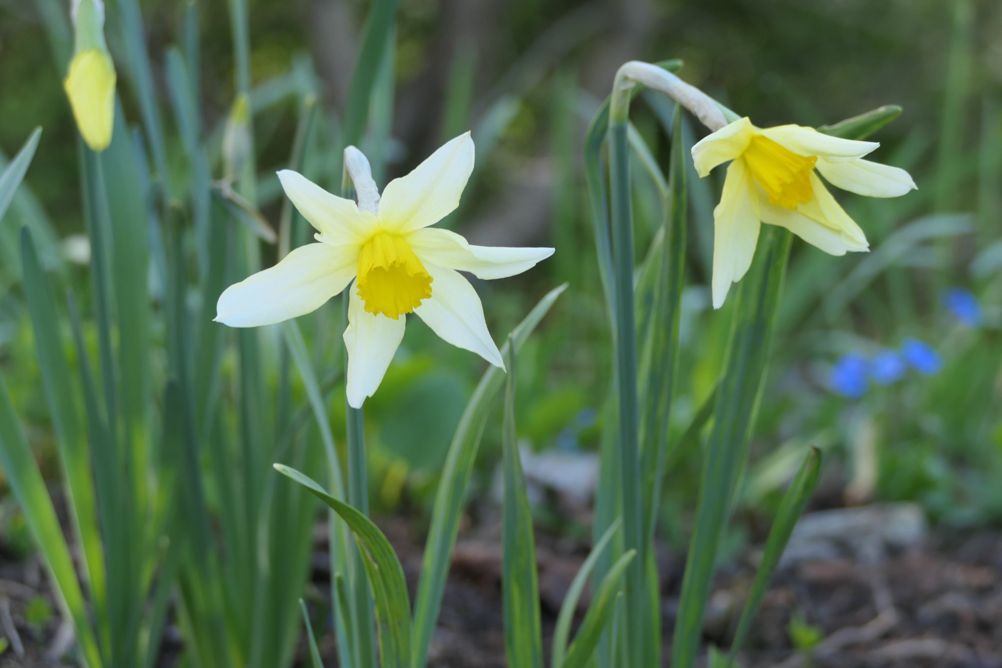 Die erste Narzisse, die in meinem Garten blüht, ist 'Peeping Tom', und sie blüht heute noch unverdrossen und makellos. :D Dabei sind 'Jetfire', 'February Silver' und eine weiße mit kurzer orangefarbener Krone, die ich nie gekauft habe (evt. 'Barrett Browning'?).