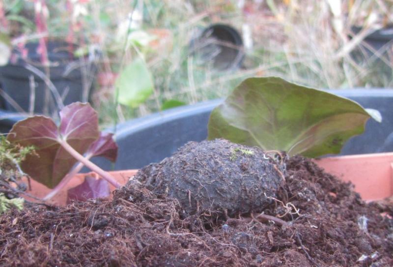 Eins lag auch noch verkehrt herum auf der Oberfläche. Da konnten die Wurzeln direkt in den Boden wachsen. Allerdings müssen sich die Blätter mühsam unter der Knolle hervorquälen.