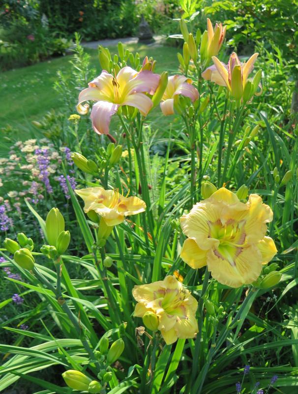 Wunderschöne Blüten zeigt ihr !Regen ist hier gemeldet, bisher sieht es jedoch nicht danach aus und ich lechze nicht danach.Es ist noch keine Hochblüte, sehr viele Sorten sind erst in einer frühen Knospenphase. Dennoch wirkt es schon recht "taglilien-blütig" in den Beeten.