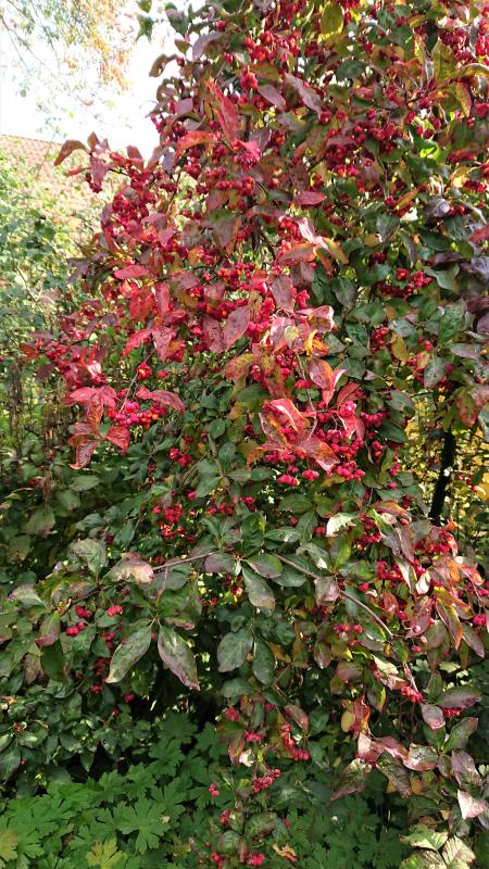 Der Europäische Hartriegel in der rotblättrigen Form beginnt zu leuchten. Am Wochenende werden die Rotkehlchen alles abgeerntet haben und alle Blätter voll durchgefärbt sein.