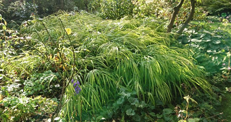 Das Japan-Waldgras ist noch nicht verfärbt, beteiligt sich aber an der Hersbststimmung.