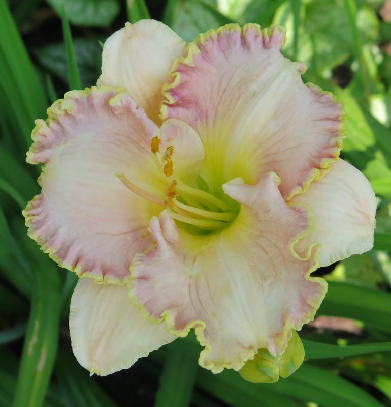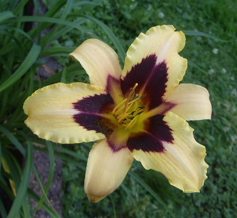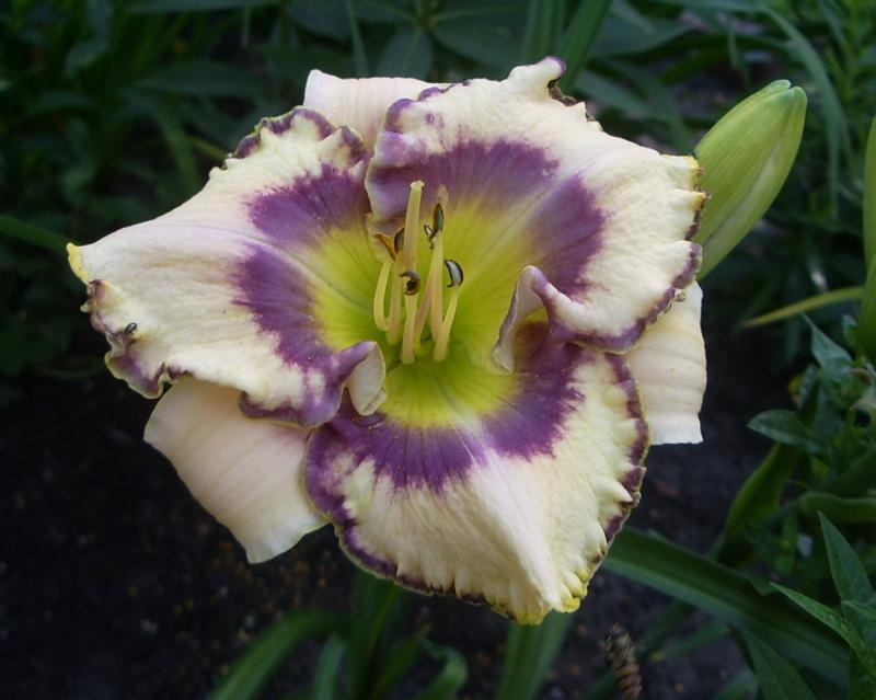 Ein wenig Akrobatik erforderte die Ansicht von Wild Horses (Trimmer, 1999), denn das Pferdchen schielte natürlich wieder mal in die falsche Richtung. Die ersten Blüten waren noch sehr viel vanilliger in der Grundfarbe, aber zuletzt wurde sie immer heller und so mag ich sie eigentlich auch am liebsten. Der Kontrast des Auges ist immer wieder eine Wucht und doch wirkt sie nicht erschlagend, weil die Blütenform leicht ist. Ich halte sie für eine gute Kombi-Pflanze.