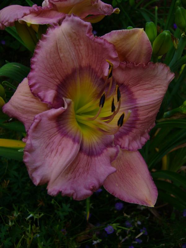 plum eyed delight, läuft gerade zur vollen form auf, hat. leider am foto nicht gut zu sehen, einen leichten lilahauch über der ganzen sonst eher rosafarbenen blüte, der zum rand hin dann in eine leichte umrandung ausläuft, aquarelleffekt. macht sie aber nur wenns floridamäßig warm ist nachts und sie viel wasser um die füße hatte.