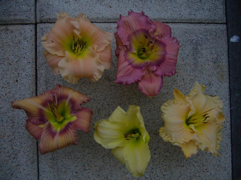 von links nach rechtsmelissa la branche, plum eyed delight, carolina heritage, umbekannte sorte, victorian lace (ist diese sehr apricotstichige farbe typisch?)carolina heritage hat leider sehr schlechte substanz, die blüten sind schon mittags ein graus
